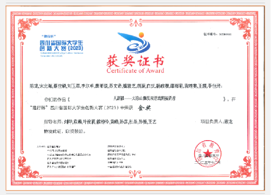 1、2023年8月,作为负责人带领团队参加四川省国际大学生创新大赛 ,获得金奖。