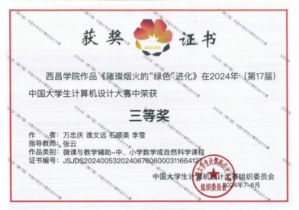 3、获得2024年(第17届)中国大学生计算机设计大赛国家级三等奖。