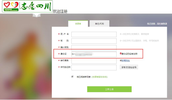 (1)在注册页面,输入身份证时系统提示身份证已被注册,如下图: