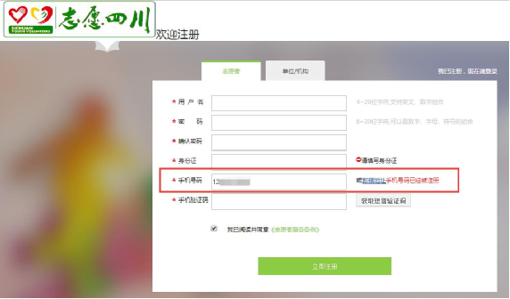 (1)在注册页面,填写手机号时系统提示手机号已注册,如下图: