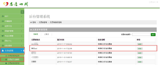 如果志愿者在个人中心选择的是“实名认证”,那么团委需要到后台的“志愿者管理”的“志愿者实名审核”这一菜单审核: