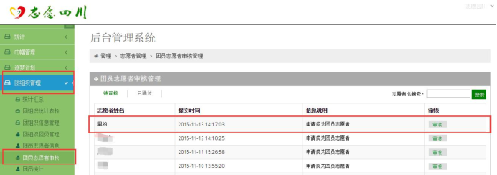 如果志愿者在个人中心选择的是“我的团队”菜单,发起的加入团队申请,那么团委需要到后台的“团队中心”的“团队招募审核”这一菜单进行审核: