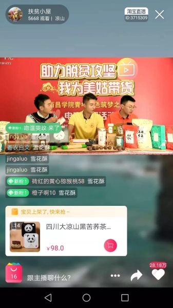 西昌学院是凉山州唯一的一所省属全日制本科院校,学校扎根凉山、服务凉山,是服务凉山脱贫奔康的行动基地。长期以来,学校充分发挥智力优势、人才优势,集中力量开展教育扶贫、科技扶贫、文化扶贫和健康扶贫,全力支持凉山脱贫奔康。  9月3日,根据省教育厅《关于组织参加中国国际“互联网+”大学生创新创业大赛“青年红色筑梦之旅”52个未摘帽贫困县全国线上对接活动的通知》,我校“扶贫小屋”学生团队代表美姑组参加的“青年红色筑梦之旅红旅之星”以购代捐电商直播大赛。为进一步提升“以购代捐”电商直播活动实际效果,以实际行动帮助美姑县精准脱贫,校工会、精准扶贫办积极倡导全校教职工购买美姑县特色农产品,学生工作部、创新创业学院、校团委积极倡导全校青年学生走进直播间关注直播活动,并与主播现场互动。截止9月3日24:00,我校“扶贫小屋”学生团队销售总额突破15万元。  今年暑期,根据《四川省教育厅关于开展“青年红色筑梦之旅”电商直播活动的通知》,我校组建了29支“青年红色筑梦之旅”学生电商直播团队,在贺盛瑜校长带领的西昌学院大凉山电商教师团队的悉心指导、校团委老师的精心组织下,通过淘宝直播的方式销售我校对口帮扶美姑县的特色农产品。       |