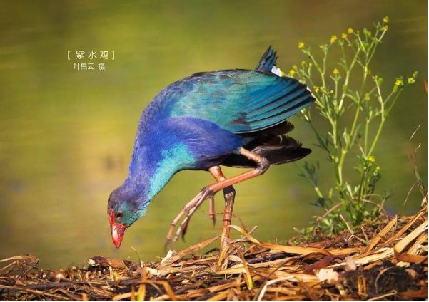 紫水鸡(Porphyrio porphyrio)。该鸟属鹤形目秧鸡科的鸟类,中型涉禽,体大(约42厘米)而壮,紫蓝色,红嘴,除尾下覆羽为白色外,整个体羽蓝黑色并具紫色及绿色闪光,有很好的观赏性,喜栖息于湖泊沼泽地及芦苇丛中,爱发出“咯、咯”与“哼、哼”声。据记载紫水鸡已在邛海湿地繁衍生息五十余载,给湿地添以大自然的纯情气氛。在湿地观鸟岛和鸟类观测站总能见到它的身影,深得游客与摄影者的青睐。紫水鸡在中国的数量较为稀少,属国家二级重点保护野生动物,被誉为“世界最美水鸟”之一。