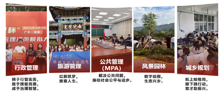旅游与城乡规划学院成立于2016年12月,2023年10月加挂公共管理学院牌子。2024年10月获批公共管理专业硕士(MPA)办学,2025年9月首届MPA研究生正式开班。现有行政管理、旅游管理、城乡规划、风景园林本科专业4个,公共管理(MPA)硕士点1个。