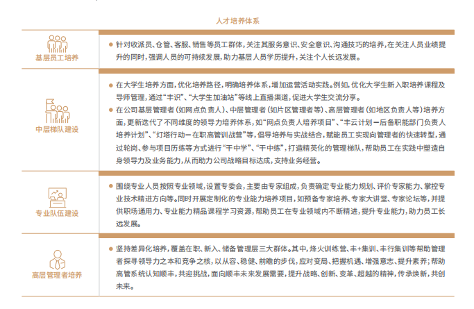 ˳·áÖØÊÓÔ±¹¤Ö°Òµ·¢Õ¹£¬»ùÓÚ¡°¾ºÕù¡¢¼¤Àø¡¢ÌÔÌ¡±ÓÃÈËÀíÄ Âäʵ¡°Ë«¼Û¡±ÓÃÈ˱ê×¼£¬´Ù½ø·ûºÏ¼ÛÖµ¹ÛÒªÇ󡢾߱¸Ê¹Ãü¸Ð¡¢³ÖÐøÓÅÐãµÄÈ˲Ÿ¡³ö²¢·¢Õ¹¡£ ¹«Ë¾ÔÚ¡¶È˲ŹÜÀíÖÆ¶È¡·ÖУ¬Ã÷È·¹æ¶¨Á˽úÉýÔÔòºÍ²»Í¬Àà±ðÔ±¹¤µÄ½úÉýÒªÇó£¬Ç¿µ÷ÈË¸ÚÆ¥ÅäºÍ¼ÛÖµ¹±Ïס£¶ÔÓÚ¼ÛÖµ¹±Ï×Í»³öµÄÔ±¹¤¸øÓè¸ü¶à·¢Õ¹»ú»á£¬²¢½«Ñ§Ï°¡¢¼¤ÀøµÈ×ÊÔ´½øÐÐÇãб¡£ 2022Ä꣬¹«Ë¾³ÖÐøÍêÉÆ¹ÜÀíºÍרҵ·¢Õ¹Ë«Í¨µÀ³É³¤»úÖÆ£¬ÎªÔ±¹¤ÌṩÁ¼ºÃµÄ·¢Õ¹Æ½Ì¨£ºÍ¨¹ý¹ÜÀí·¢Õ¹Í¨µÀ£¬Èþ߱¸Ò»¶¨¹ÜÀíÄÜÁ¦µÄÔ±¹¤²ÎÓëÆóÒµÔËÓª¹ÜÀí£»Í¨¹ýרҵ·¢Õ¹Í¨µÀ£¬Èü¼ÊõÀàÔ±¹¤Í¨¹ý²»¶ÏÌáÉý¸öÈ˼¼ÄÜ£¬»ýÀÛרҵ¾Ñ飬³ÉΪ¸÷ÁìÓòר¼Ò¡£