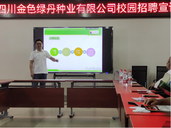 招聘会上,四川金色绿丹种业有限公司校招负责人王旭对公司概况、企业产品、企业文化、需求岗位以及公司的人才培养计划等进行了详细介绍,并针对学生们提出的问题作了一一解答,充分调动了同学们参与的积极性。招聘会现场氛围热烈。