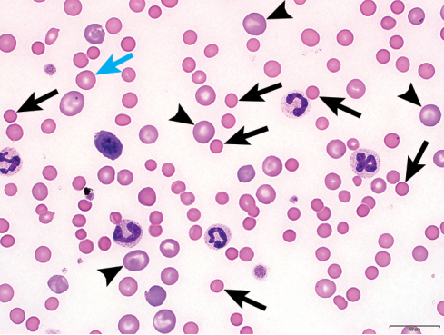 Çò×´ºìϸ°û£¨ºÚÉ«´ø±ú¼ýÍ·£©Ìå»ý¸üС£¬ÑÕɫƫ°µµÄ·ÛºìÉ«£»ÓëÕý³£ºìϸ°ûÏà±È£¬ËüÃÇûÓÐÖÐÑë²Ô°×Çø£¨À¶É«¼ýÍ·£©¡£Æµ·±³öÏֵĴóÐͶàȾÐÔºìϸ°û£¨¶Ì¼ýÍ·£©±íÃ÷ÓÐÔÙÉú£¬ÀàËÆÓÚÍøÖ¯ºìϸ°û¡£