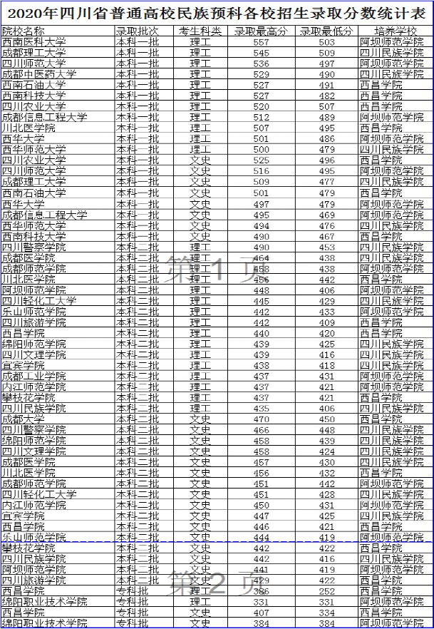 l2020ÄêËÄ´¨Ê¡ÆÕͨ¸ßУÃñ×åÔ¤¿Æ¸÷УÕÐÉú¼ȡ·ÖÊýͳ¼Æ±í