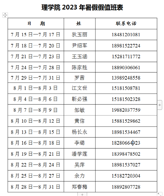 西昌学院2023年暑假放假时间为7月15日至8月31日,以下为理学院2023年暑假值班表,若在暑假期间有事请联系表格中对应日期的相应老师。