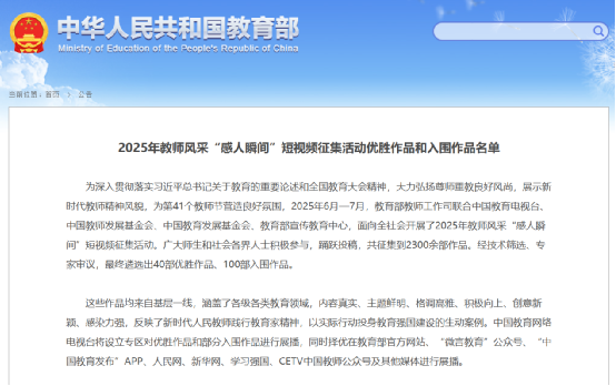 2025ÄêÐÂʱ´ú½Ìʦ·ç²É¶ÌÊÓÆµÕ÷¼¯»î¶¯ÓɽÌÓý²¿½Ìʦ¹¤×÷˾ÁªºÏÖйú½ÌÓýµçÊǪ́¡¢Öйú½Ìʦ·¢Õ¹»ù½ð»á¡¢Öйú½ÌÓý·¢Õ¹»ù½ð»á¡¢½ÌÓý²¿Ðû´«½ÌÓýÖÐÐÄ¿ªÕ¹£¬ÃæÏòÈ«Éç»áÕ÷¼¯¡£¾¼¼Êõɸѡ¡¢×¨¼ÒÉóÒ飬×îÖÕåàÑ¡³ö40²¿ÓÅʤ×÷Æ·¡¢100²¿ÈëΧ×÷Æ·¡£