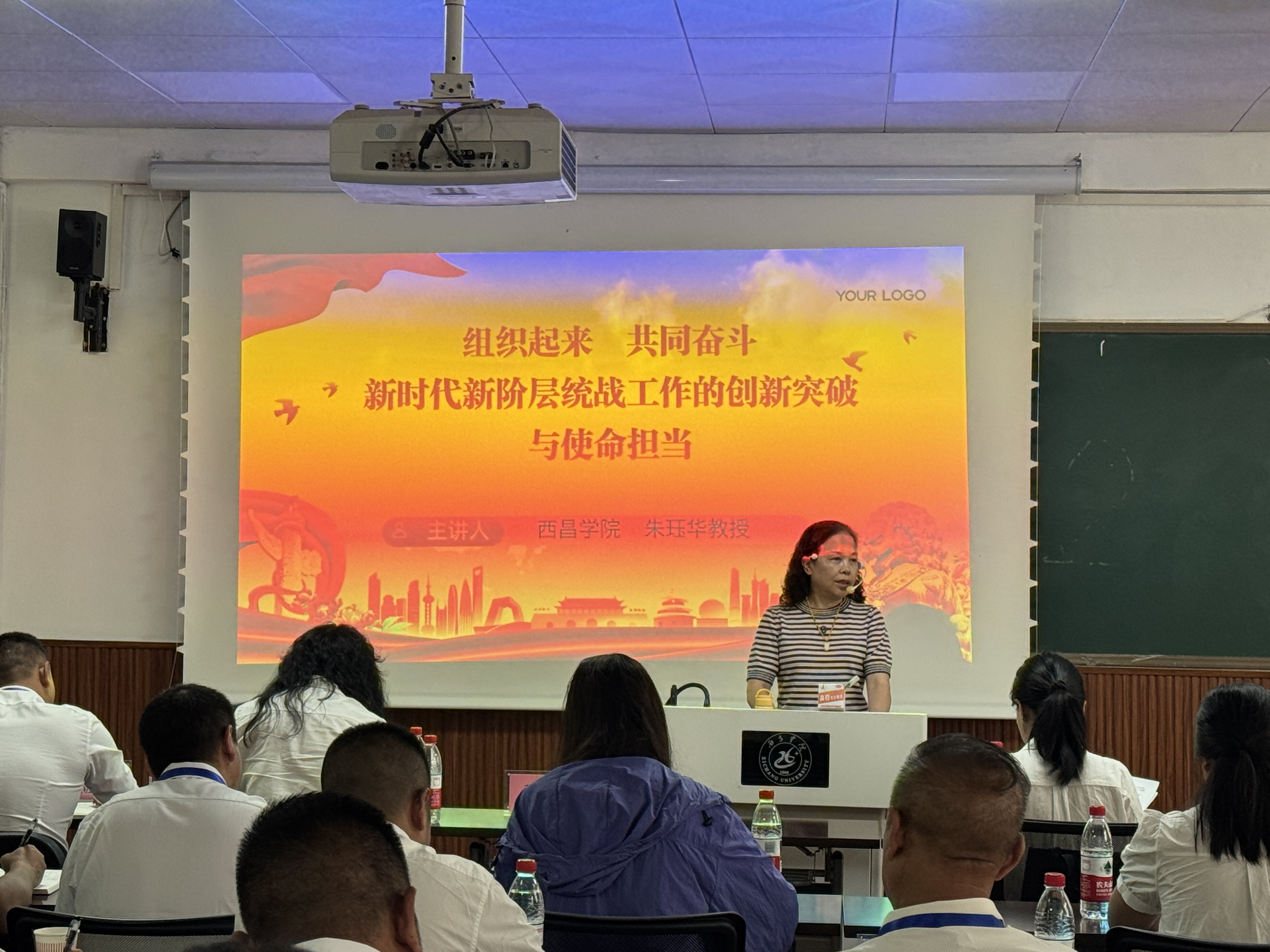 2025年6月23日上午,九三学社西昌学院基层委员会副主委朱珏华教授在西昌学院邛海校区为美姑县2025年统战系统干部综合能力提升专题研讨班开展了题为“组织起来,共同奋斗——新时代新阶层统战工作的创新突破与使命担当”的讲座。