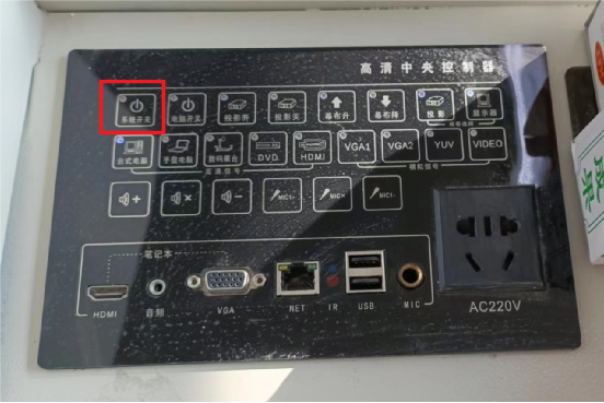 下课时仅需点击桌面中控左上角(如下图所示)“系统开关”,一键关闭系统(含电脑和大屏),系统关闭后指示灯变为红色。
