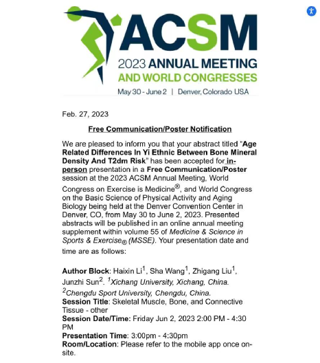 近日,我院2020级体育教育专业李海昕同学研究论文 《Age Related Differences In Yi Ethnic Between Bone Mineral Density And T2dm Risk》(世居亚高原彝族老年人骨密度与糖尿病发病风险相关研究)收到美国运动医学学会(ACSM)的录用通知,将于5月30日至6月2日参加ACSM 2023年年会和世界大会(美国·科罗拉多州·丹佛),该论文将在Medicine & Science in Sports& Exercise (SCI,JCR Q1)期刊中发表。李海昕同学在西昌学院体育学院伍朝明老师、王沙老师、刘志刚老师、孙君志教授(成都体育学院运动医学与健康研究所、Sports Medicine and Health Science期刊编辑部主任)的指导下以第一作者身份完成论文,西昌学院体育学院为第一完成单位。