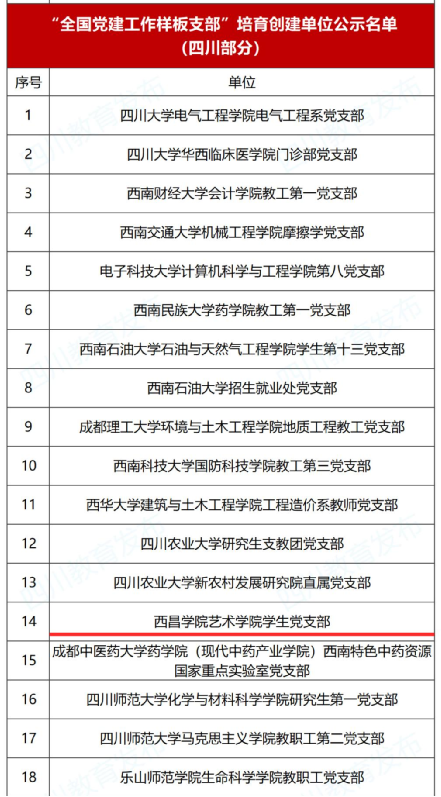 ½üÈÕ£¬½ÌÓý²¿°ì¹«Ìü¹«²¼Á˵ÚËÄÅúÐÂʱ´ú¸ßУµ³½¨Ê¾·¶´´½¨ºÍÖÊÁ¿´´Óʤ×÷ÆÀÑ¡½á¹û¡£´Ë´Î¸ßУµ³½¨¡°Ë«´´¡±¹¤×÷¹²ÃæÏòÈ«¹ú¸ßУ¹²åàÑ¡³ö10¸öµ³½¨¹¤×÷ʾ·¶¸ßУ¡¢100¸öµ³½¨¹¤×÷±ê¸ËԺϵ¡¢1001¸öµ³½¨¹¤×÷Ñù°åÖ§²¿×÷ΪÅàÓý´´½¨µ¥Î»£¬ÎÒУÒÕÊõѧԺѧÉúµ³Ö§²¿ÈëÑ¡¡°È«¹úµ³½¨¹¤×÷Ñù°åÖ§²¿¡±ÅàÓý´´½¨µ¥Î»£¬½¨ÉèÖÜÆÚΪ2Äê¡£
